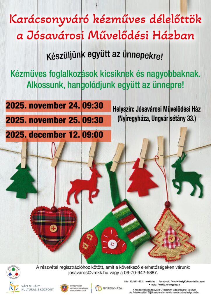 Karácsonyváró kézműves délelőttök Helyszín: Jósavárosi Művelődési Ház, 4400 Nyíregyháza, Ungvár sétány 33. Dátum: 2025.11.24.