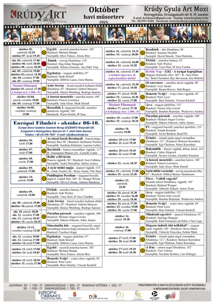 Október havi moziműsor Helyszín: Krúdy Art Mozi, 4400 Nyíregyháza, Országzászló tér 8. IV. emelet Dátum: 2025.október Októberben is vár a Krúdy Art Mozi!