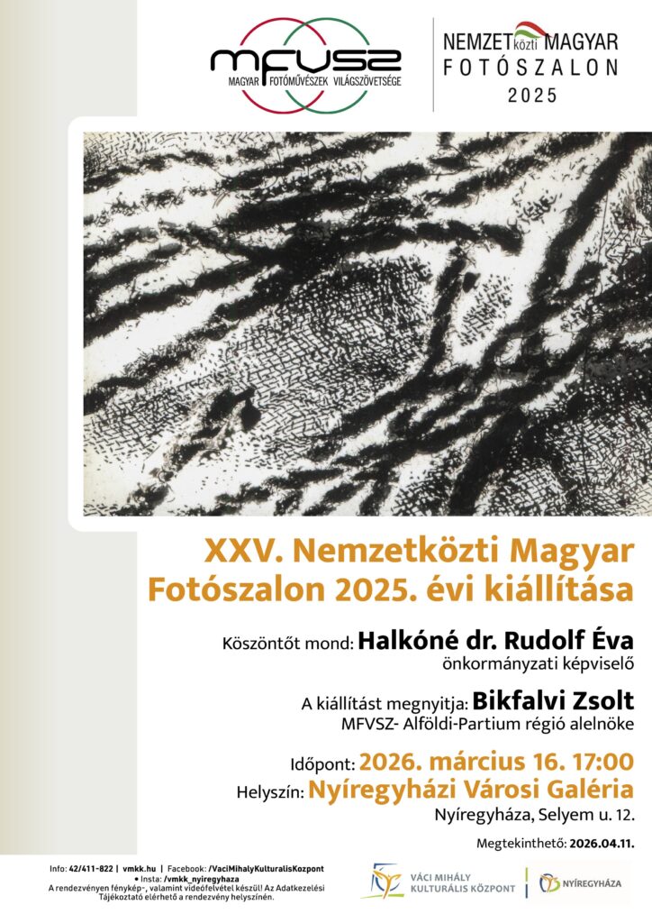 XXV. Nemzetközti Magyar Fotószalon 2025. évi kiállítása nyílik 2026. március 16-án. A tárlatnak a Nyíregyházi Városi Galéria ad otthont.